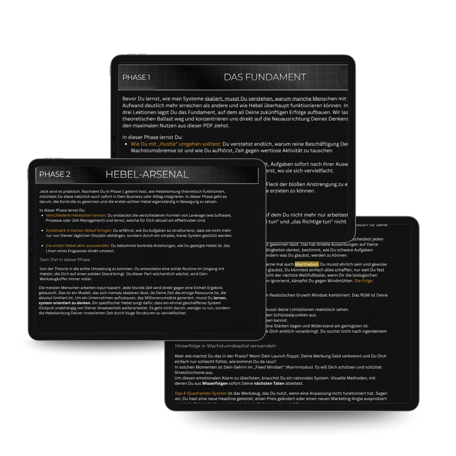 Phase 2: Das Hebel-Arsenal – Sobald das Fundament steht, gehen wir in die Praxis. In dieser Phase erhältst du Zugriff auf ein stätig wachsendes Hebel-Arsenal – eine Sammlung spezifischer, technischer Strategien, die darauf ausgelegt sind, deinen Output zu maximieren. Das Ziel: Den Sprung vom bloßen Verstehen zur aktiven Steuerung deines Projekts zu schaffen. Du lernst, individuelle Hebel so einzusetzen, dass du Hindernisse rational auswertest und dein Business durch gezielte Hebelwirkung systematisch auf Wachstumskurs bringst.